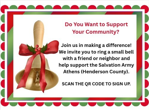 Join us in making a difference! We invite you to ring a small bell with a friend or neighbor and help support the Salvation Army Athens (Henderson County) Service Units Red Kettle Campaign. All proceeds stay in Henderson County to support local programs and services.